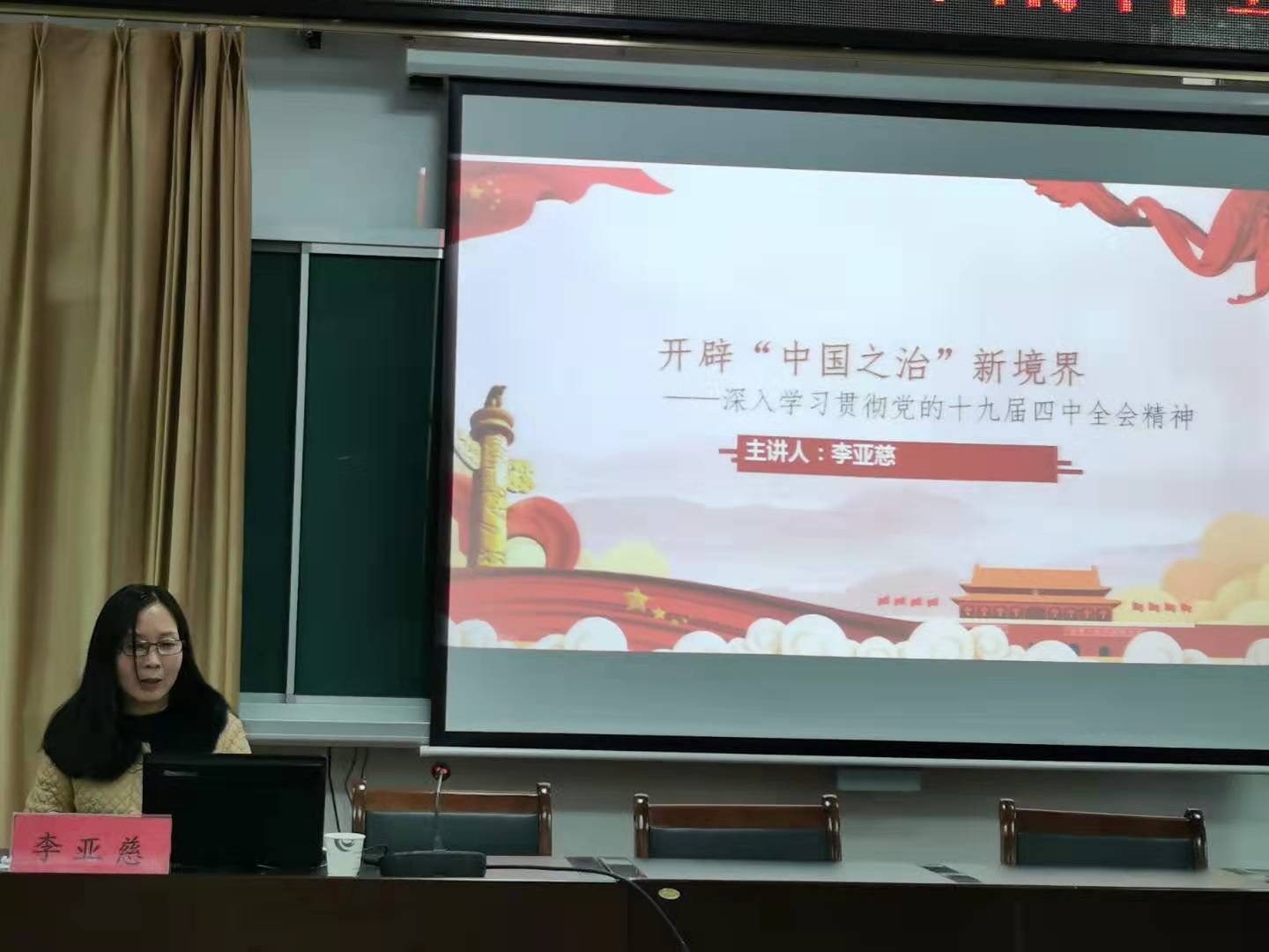 李亚慈分别从“充分认识坚持和完善中国特色社会主义制度、推进国家治理体系和治理能力现代化的重大意义;深刻领会中国特色社会主义制度和国家治理体系的显著优势,坚定中国特色社会主义制度自信;准确把握坚持和完善中国特色社会主义制度、推进国家治理体系和治理能力现代化的总体要求、总体目标和重点任务;加强党的领导,确保全会确定的各项目标任务全面落实到位”四个方面对四中全会精神进行了深入分析与解读。