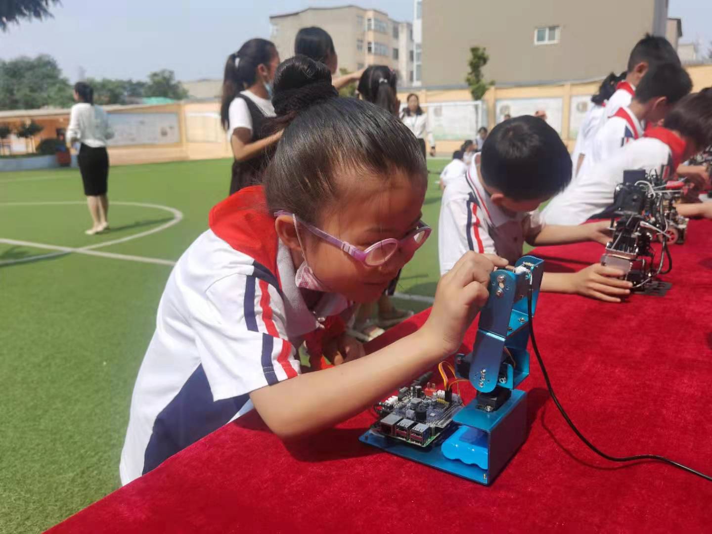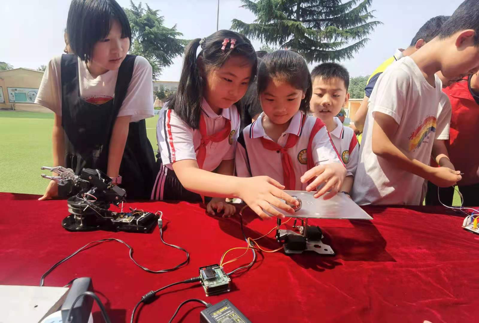 科技展览活动现场,“大黄蜂跳舞机器人”能够跟随音乐手舞足蹈,“两足机器人”在自由行走的同时还能完成翻跟头等动作,“平衡球”向小员工们展示了平衡的魅力,“手指上的音乐”左、右手同时触摸导线就能发出奇妙的音乐声,“工业机器人”能够按照设定程序完成指定动作,最引人注目的当属翱翔在空中的“无人机”。