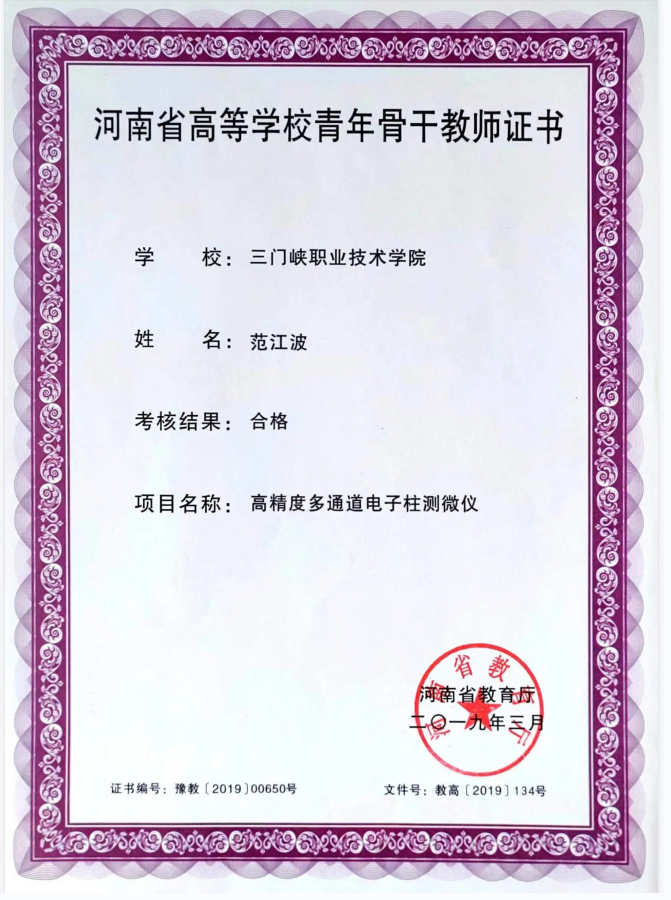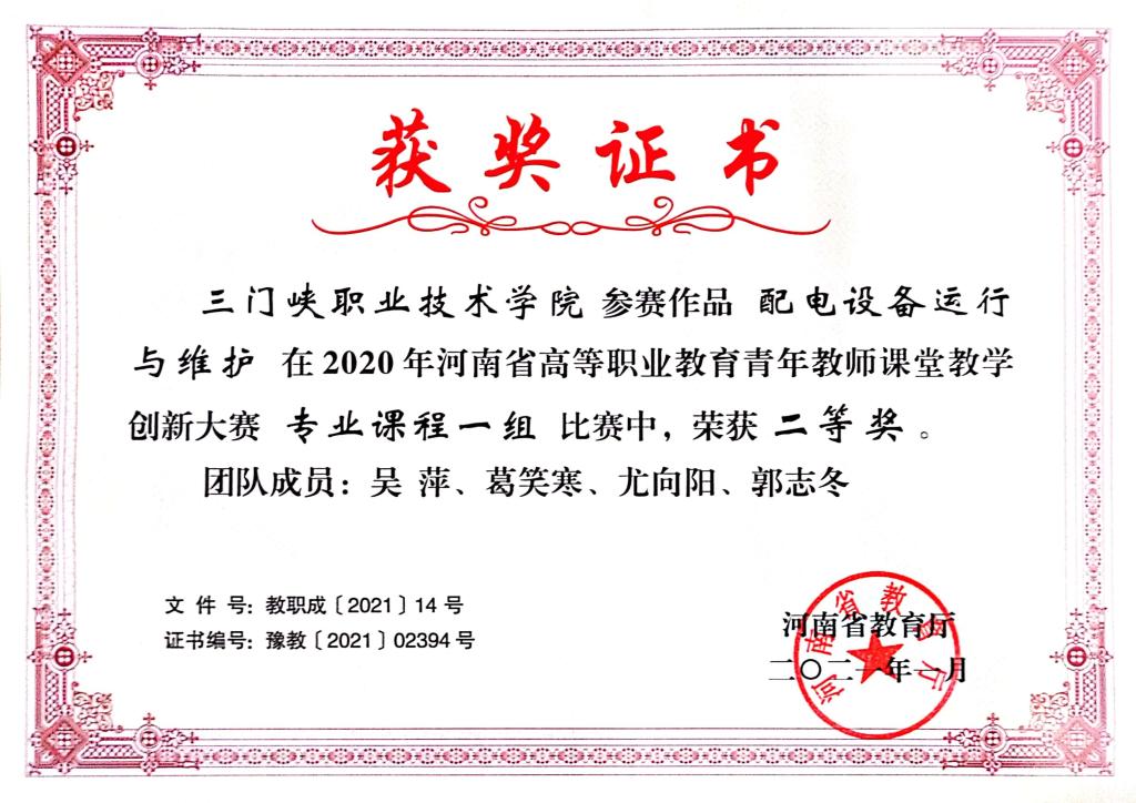2020年河南省高等职业教育青年教师课堂教学创新大赛二等奖获奖证书