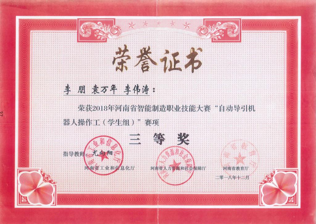 2018年河南省智能制造职业技能大赛“自动导引机器人操作工”三等奖