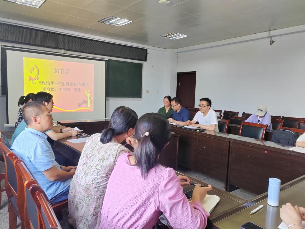 会议第五项,第一部分,“政治生日”党员李启松、尤向阳、吴萍谈初心感悟。