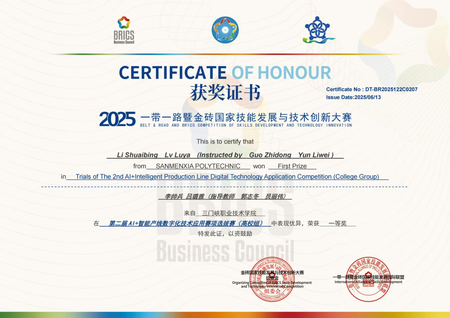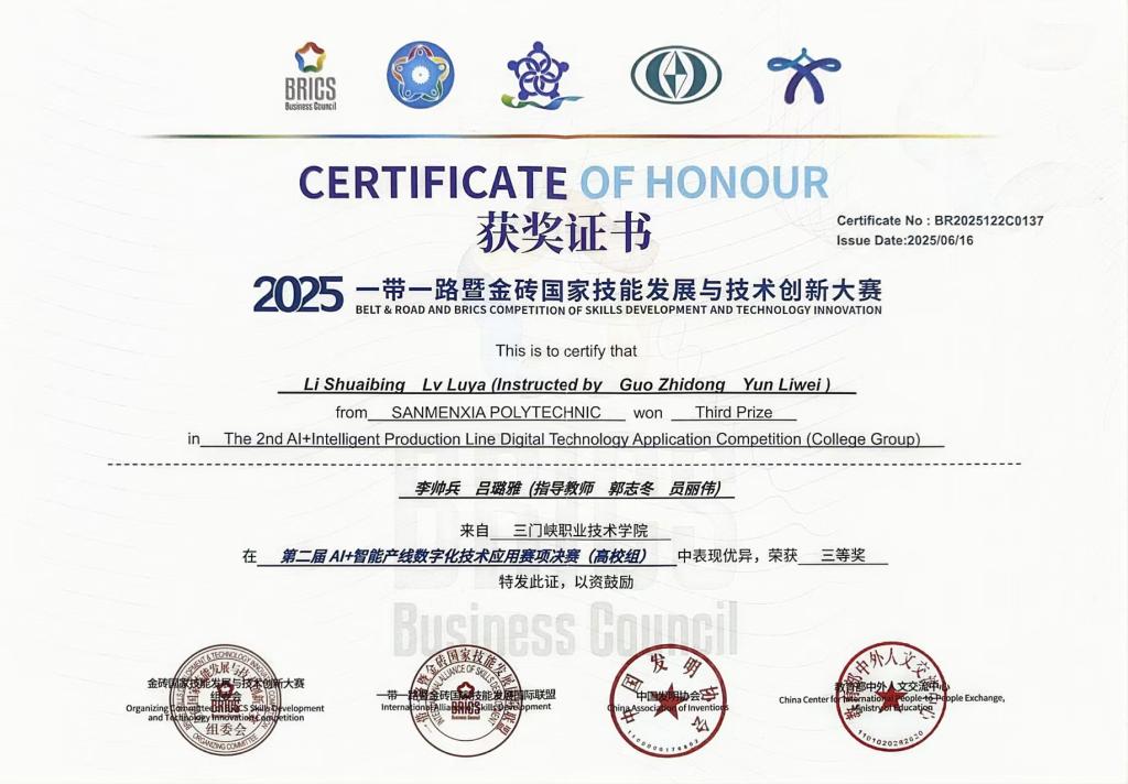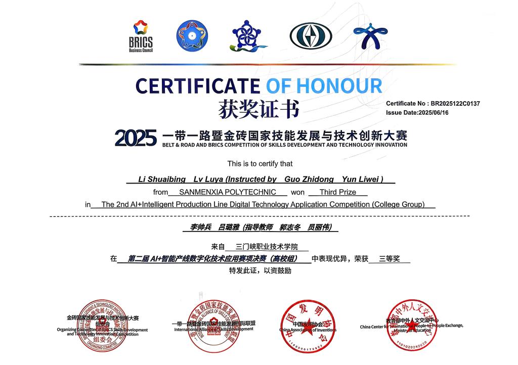 在6月16日结束的 2025 一带一路暨金砖国家技能发展与技术创新大赛中,由yl6809永利潘文凯、张博宇、李帅兵、吕璐雅四位同学组成的两支参赛队,经过激烈角逐,最终荣获第二届 AI + 智能产线数字化技术应用赛项三等奖两项。