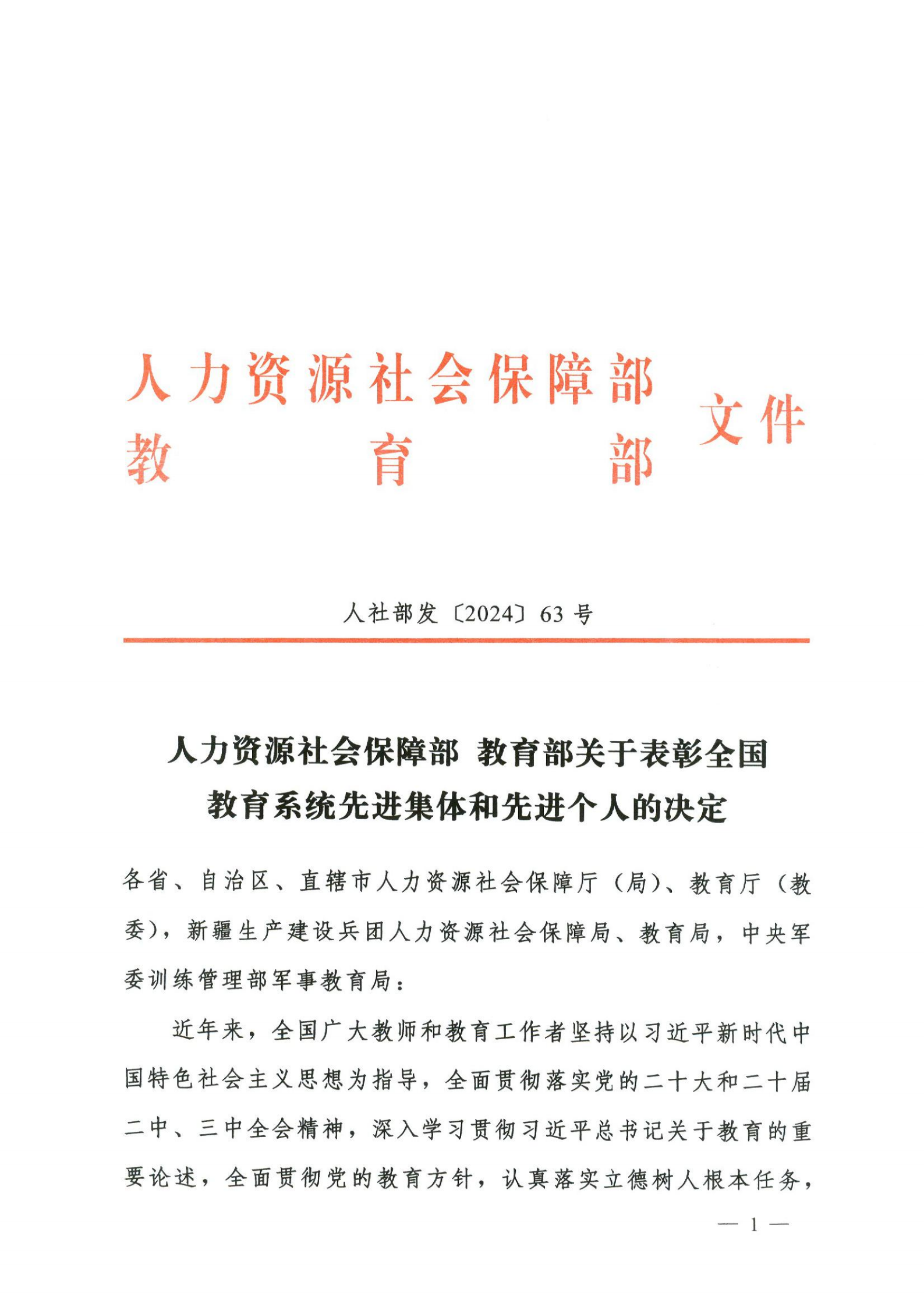 近日,人力资源社会保障部、教育部发布了《关于表彰全国教育系统先进集体和先进个人的决定》(人社部发〔2024〕 63号),yl6809永利尤向阳老师荣获“全国优秀教师”称号。