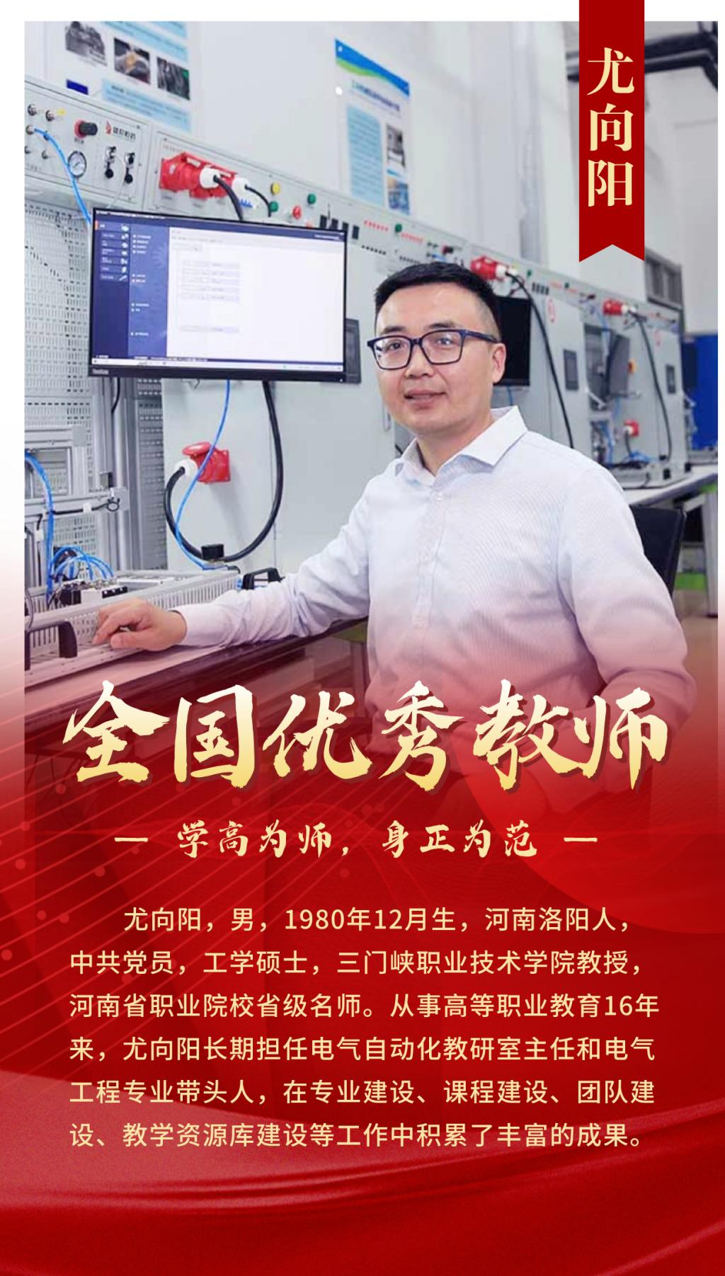 尤向阳,男,1980年12月生,河南洛阳人,中共党员,工学硕士,公司教授,河南省职业院校省级名师。从事高等职业教育16年来,尤向阳长期担任电气自动化教研室主任和电气工程专业带头人,在专业建设、课程建设、团队建设、教学资源库建设等工作中积累了丰富的成果。