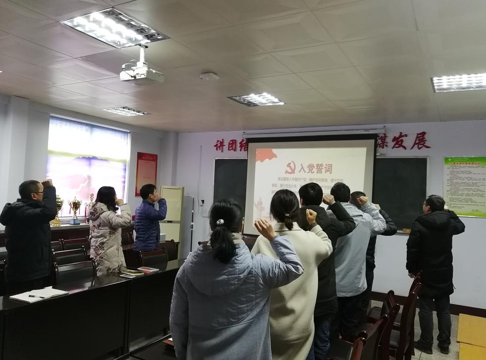 首先,重温入党誓词,在支部统战委员刘新源的领誓下,全体党员面向党旗庄严宣誓,这不仅是庄严神圣的仪式,更重要的在于宣誓忠诚、牢记使命、坚定信念,表达拥护党的纲领、遵守党的章程、履行党员义务、执行党的决心、严守党的纪律、保守党的秘密、对党忠诚,愿为共产主义奋斗终身的坚定态度和决心。