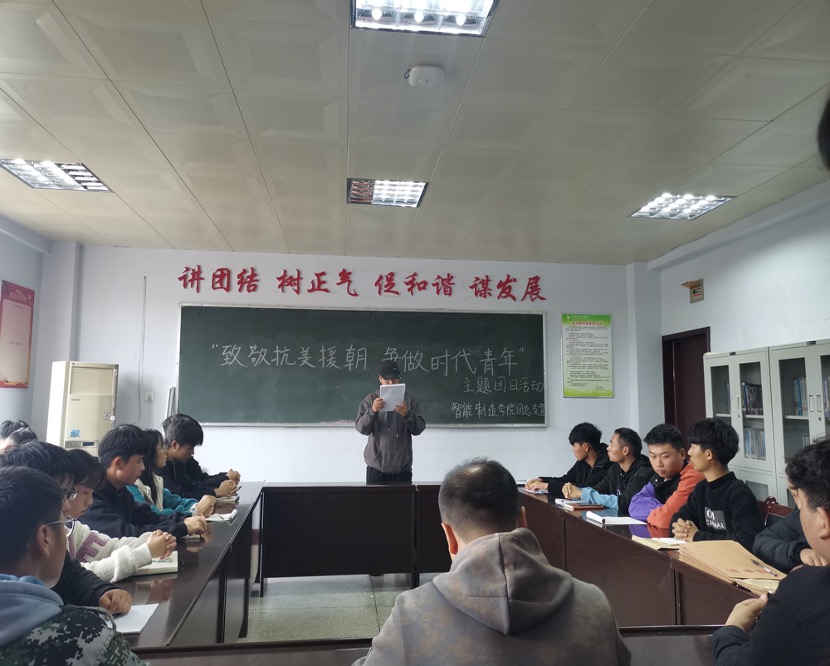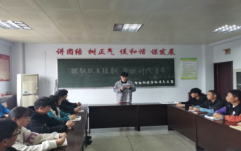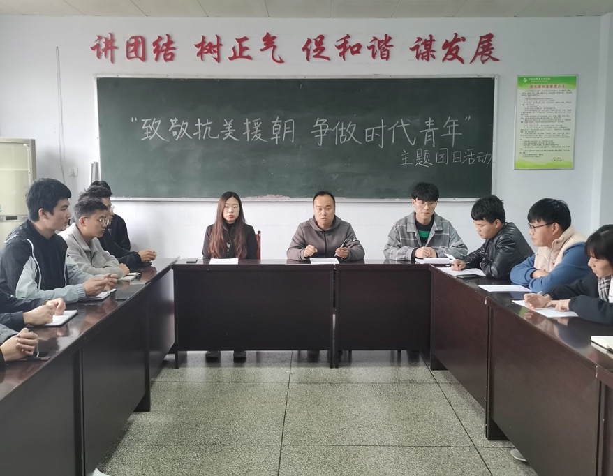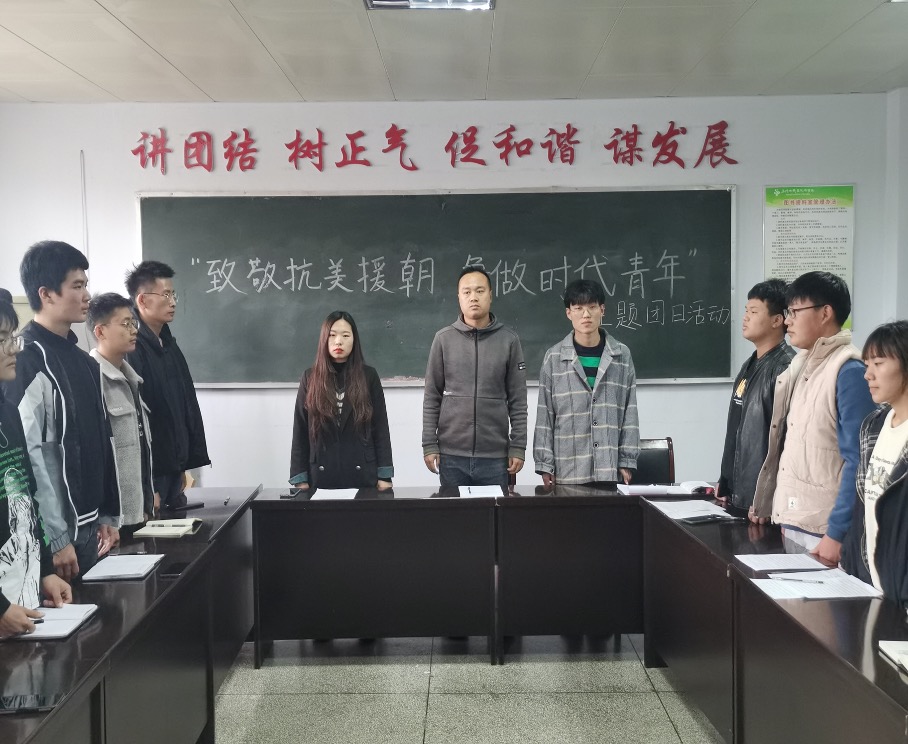 本次团日活动的主题是“致敬抗美援朝 争做时代新人”,包括三个部分。第一部分是召开团员座谈会,学习习近平总书记在纪念中国人民志愿军抗美援朝出国作战70周年大会上的讲话。同学们重温入团誓词,齐声高唱中华人民共和国国歌《义勇军进行曲》和中国共青团团歌《光荣啊,共青团》。座谈会上,同学们表示作为新时代的老员工,要追思过去、铭记历史,从历史和革命先辈的事迹中汲取精神养料,发挥专业优势勇挑信息时代重担。