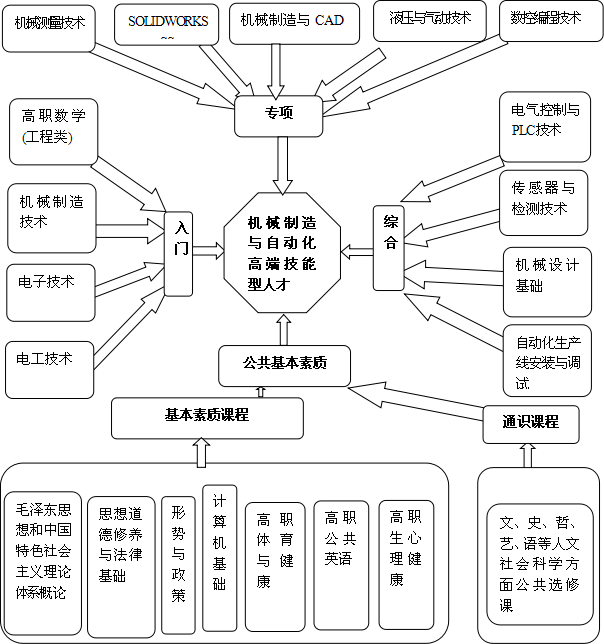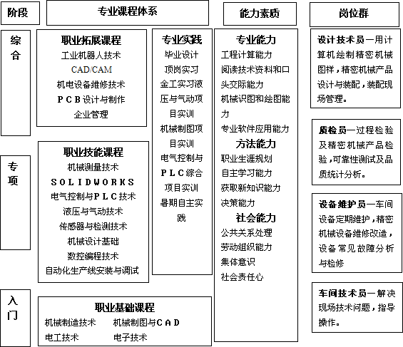 依据认知规律对学习领域进行排序,形成入门、专项、综合课程排序结果,从而构建出职业课程体系。入门课程为高职数学(工程类)、机械制造基础、电工技术及电子技术,专项课程为机械测量技术、SOLIDWORKS、机械制造与CAD、液压与气动技术及数控技术,综合课程为电气控制与PLC技术、传感器与检测技术、机械设计基础、自动化生产线安装与调试。