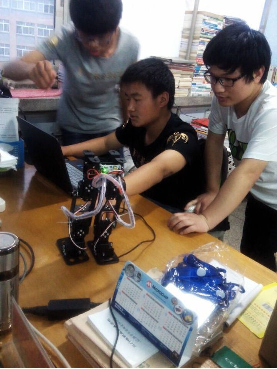 就在创意大赛进入倒计时的时候,一次调试发现第二组同学的机器人左腿的一个舵机不会动了,这可急坏了14电信的小伙子们,眼看大赛迫在眉睫,机器人不能按照设定的动作跳舞,怎么办?组长靳振宇说,拆下来再仔细查查。于是大家就把出问题的舵机拆下来了,拧开螺丝打开舵机外壳,漏出舵机内的电路板,他们笑了。原来舵机电源线“-”极那根线断了。调试成功后,当看到俩机器人兄弟按照自己设计的动作跳起舞来的时候,同学们激动地欢呼,接着紧紧地相拥在一起,内心的喜悦无以言表,8名同学中唯一的女生甚至激动地掉下了眼泪。